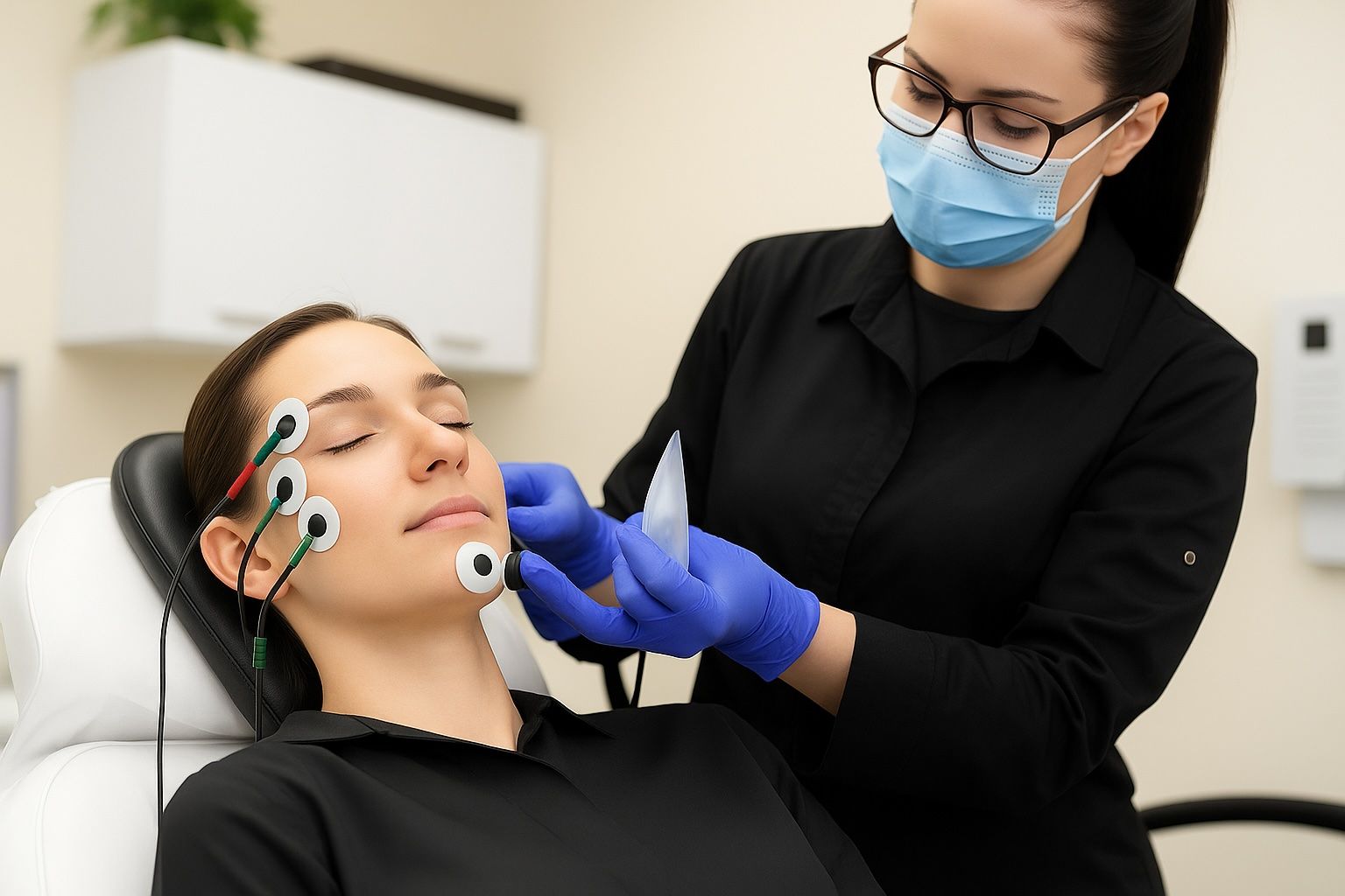 EMG Analysis measures the activity of your jaw muscles as they work, helping us understand how they respond to your bite in real time. Small, painless surface sensors record electrical signals from key muscles around the jaw and temples.